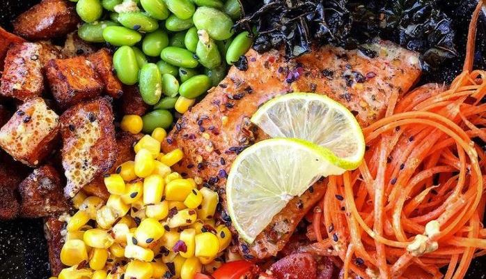 - Remove the sweet potato, salmon and kale from the oven and place into a serving bowl.
